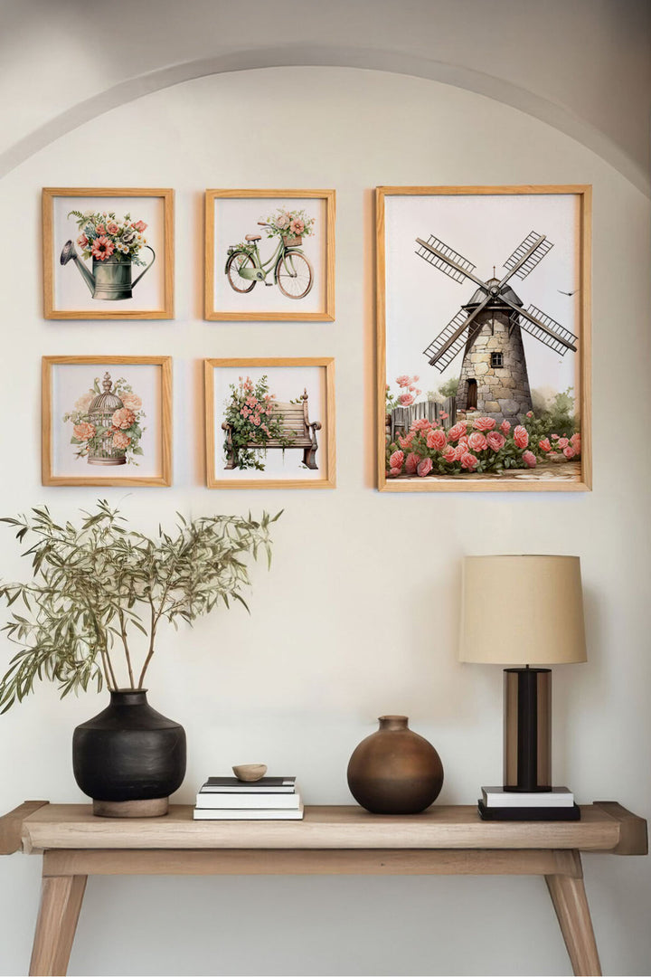 Çiçek Desenli Modern Tablo Seti - 5’li Ahşap Çerçeve | huhu465
