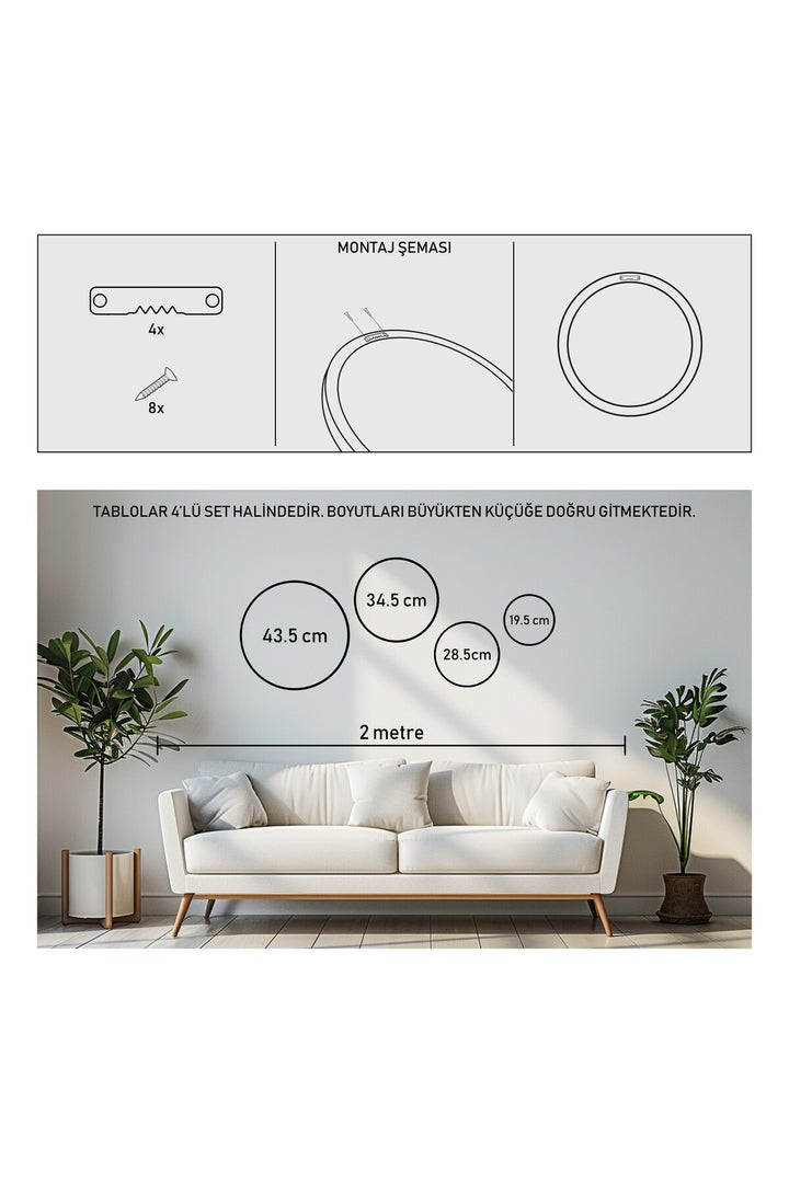 Dekorasyonunuza doğal bir dokunuş katarak, 5 farklı boydan oluşan yuvarlak ahşap tablo seti. MDF üzerine dayanıklı ahşap çerçeveli tasarımıyla uzun ömürlü kullanım sağlar. Oturma odasından yatak odasına, ofislerden kafelere kadar her ortamda estetik bir görünüm yaratır. Birlikte ya da tek başına kullanarak yaşam alanlarınızı kişiselleştirin. Ürün 5 farklı ölçüden oluşmaktadır. **Ürün Özellikleri:** • 5 Farklı Boyut: 45 cm, 39 cm, 33 cm, 27 cm, 21 cm boyutlarında çeşitlilik • Doğal Ahşap Çerçeve: %100 doğal ahşap çerçeveler ile dayanıklı yapı • UV Baskı Teknolojisi: MDF üzerine yüksek kaliteli UV baskı ile net görüntü • Ömür Boyu Garanti: Solmama garantili, uzun süre parlaklığını korur **Kullanım Alanları:** • Oturma odası, yatak odası, ofis ve kafe dekorasyonu • Duvara çivi yardımıyla kolay montaj • İstediğiniz dizilimde veya farklı kombinasyonlarda asabilirsiniz • 3'lü, 5'li şeklinde farklı duvarlarda konumlandırma imkanı Hemen keşfedin. Pastel tonlarda 4'lü tablo seti, yaşam alanınıza sıcak bir dokunuş katar. Modern tasarımıyla ev dekorasyonunuza uyum sağlar. Online satın alın.