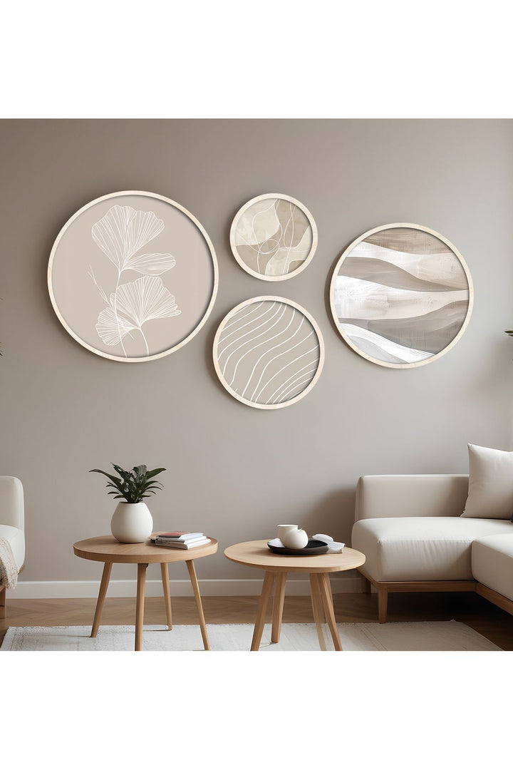 Soyut Desenli Bej Tablo Seti - 4'lü Yuvarlak Set | huhu295