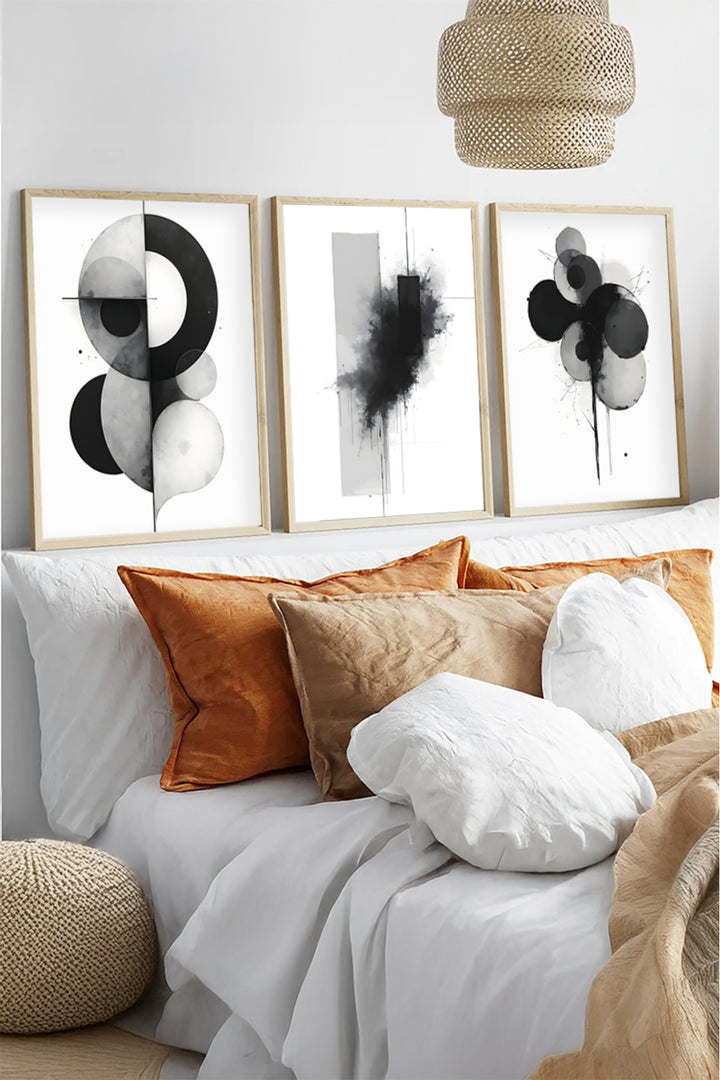 Soyut Desenli Siyah-Beyaz Tablo Seti - Modern 3’lü Set | huhu434