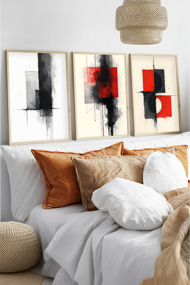 Soyut Desenli Siyah-Kırmızı Tablo Seti - Modern 3’lü Set | huhu440